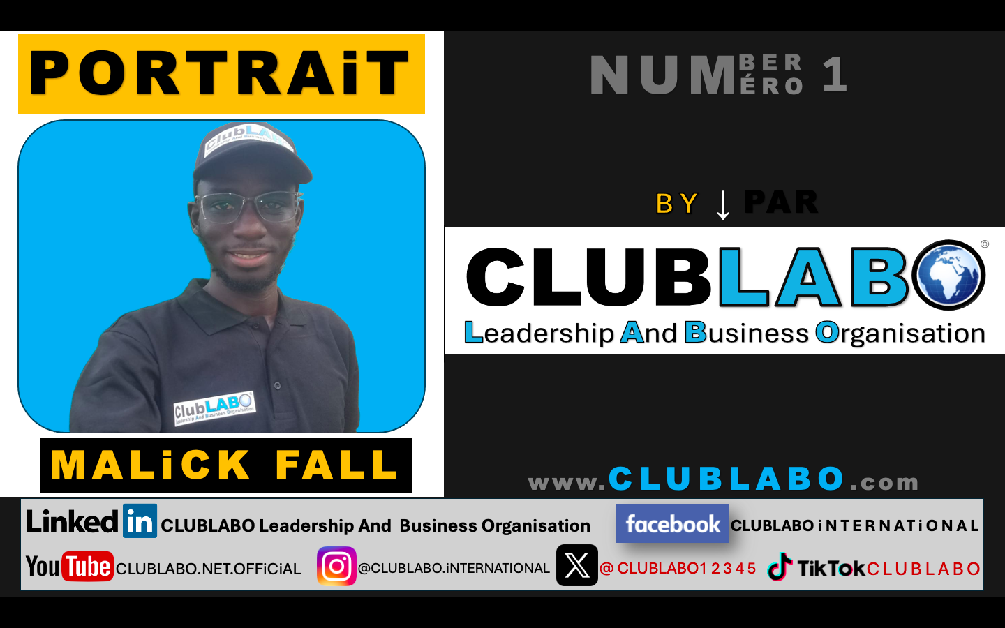 MALiCK FALL est le fondateur du Groupe ELMAFA Holding qui contrôle le club d’affaires CLUBLABO international et l’industrie d’emballages biodégradables en papiers dénommée SEN-BAG Company. Celle-ci est la première entreprise qu’il a créée en 2013 alors qu’il n’était âgé que de vingt (20) ans, juste après le décrochage de son Baccalauréat avec la mention assez bien. Par ailleurs, Malick FALL est l’auteur du livre best-seller (meilleure vente Amazon) intitulé << Comment transformer des rêves en succès ? >>. En tant que jeune entrepreneur Africain d’origine sénégalaise, Malick FALL est le Président co-fondateur du club d’affaires CLUBLABO international . Ainsi, son objectif est de promouvoir positivement le Leadership et le Business (Entrepreneuriat) dans le monde entier et plus particulièrement en Afrique. En réalité, Malick FALL est un consultant international certifié en E-Commerce (vente en ligne) et en intelligence Économique par ITC (international Trade Centre) qui est une structure co-fondée par l’ONU (Organisation des Nations Unies) et l’OMC (Organisation Mondiale du Commerce). Par ailleurs, le visionnaire Malick FALL est l’initiateur et le Président du CEPEB (Collectif des Entreprises Productrices d’ Emballages Biodégradables). Enfin, il a voyagé dans une dizaine de pays et il parle plusieurs langues dont l’Anglais, l’Arabe, le Français et le Wolof. #CLUBLABO